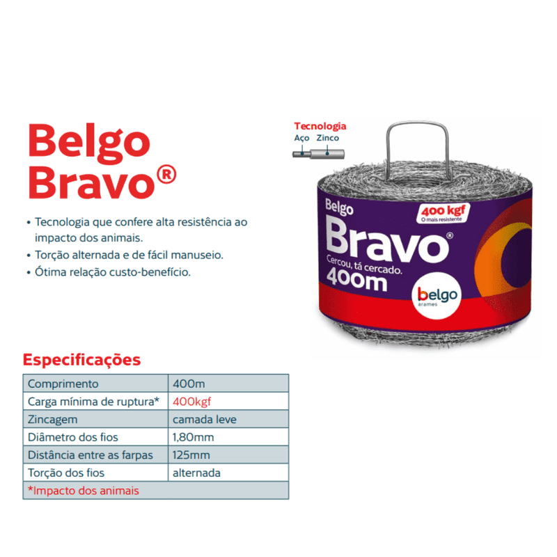 O Arame Farpado Bravo Belgo® é a escolha certa para pecuaristas e produtores rurais que criam gado de corte. Seus fios robustos possuem 1,80 mm de diâmetro e 400 kgf de carga mínima de ruptura, aguentando com facilidade o impacto de bovinos fortes, bravos e rústicos, sem comprometer sua qualidade.
