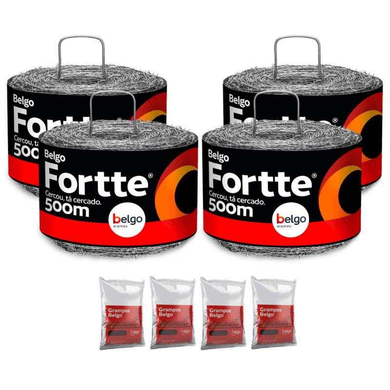 Kit Cerca: 4 Rolos de Arame Fortte 500m + 4 Pacotes de Grampos Galvanizados 1 KG com 5% de desconto. Ideal para cercas rurais, com grampos e arame de alta resistência para uma instalação perfeita. Aproveite a oferta!