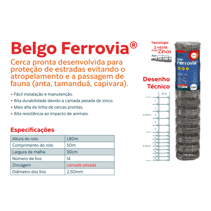 TELA BELGO FERROVIA 1,80M 14 FIOS 50 M