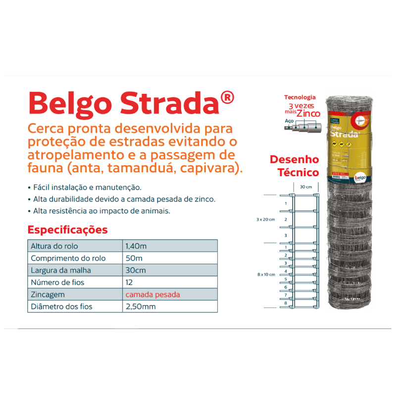 Com sua instalação simples e fácil manutenção, a Belgo Strada® oferece alta resistência e durabilidade. Composta por uma estrutura de 1,4m de altura e 12 fios horizontais trançados com arames verticais, e revestida com uma camada pesada de zinco, garante uma proteção robusta.
