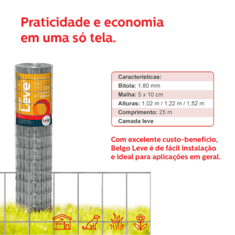 Tela Soldada Belgo Leve 5x10 Fio 1,80mm 1,52m x 25m é uma tela fabricada com arames de aço, galvanizados e eletrosoldadas. Com sua leveza, tem uma versatilidade de aplicações e um excelente custo-benefício, podendo ser aplicada em jardins, hortas, contenção de pequenos animais e para delimitar o acesso de pessoas a determinado espaço, ou em requadros metálicos para fechamento de vãos e cercamentos em geral.